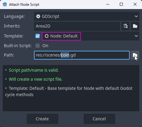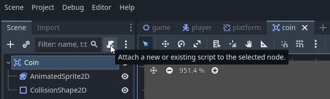 1. To create a new script, while the "coin" Scene and "Coin" Node are selected, click the "Attach a new or existing script to selected node" button:
