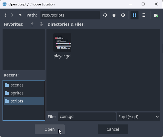 3. In the opened window, go to the "scripts" directory, select the "coin.gd" file and click the "Open" button.
