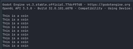 No action takes place in the game, but the message "This is a coin" is written to the screen in the "Output" window at the bottom of the development environment, once for each coin in the scene.
