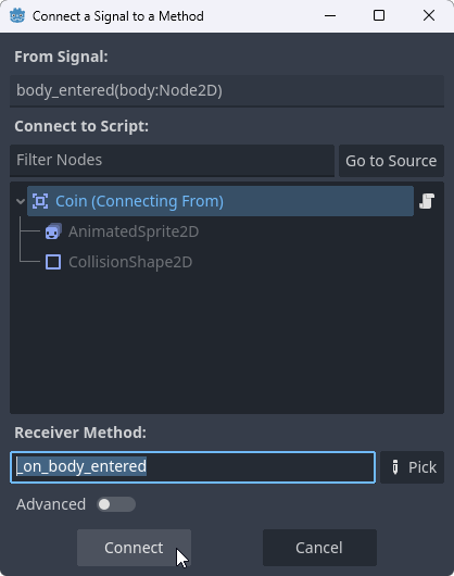 7. To connect the signal, when the "Coin" Node is selected, when we click on the "Node" tab on the right, we see many signals. Double-click on the body_entered signal and click the "Connect" button in the window that opens.