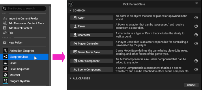Unreal Engine Editor Content Drawer içinde fareye sağ tıkladığımızda açılan menüden "Blueprint Class" seçeneğini seçtiğimizde karşımıza gelen pencerede gösterilen "Genel sınıflar" aşağıdadır.