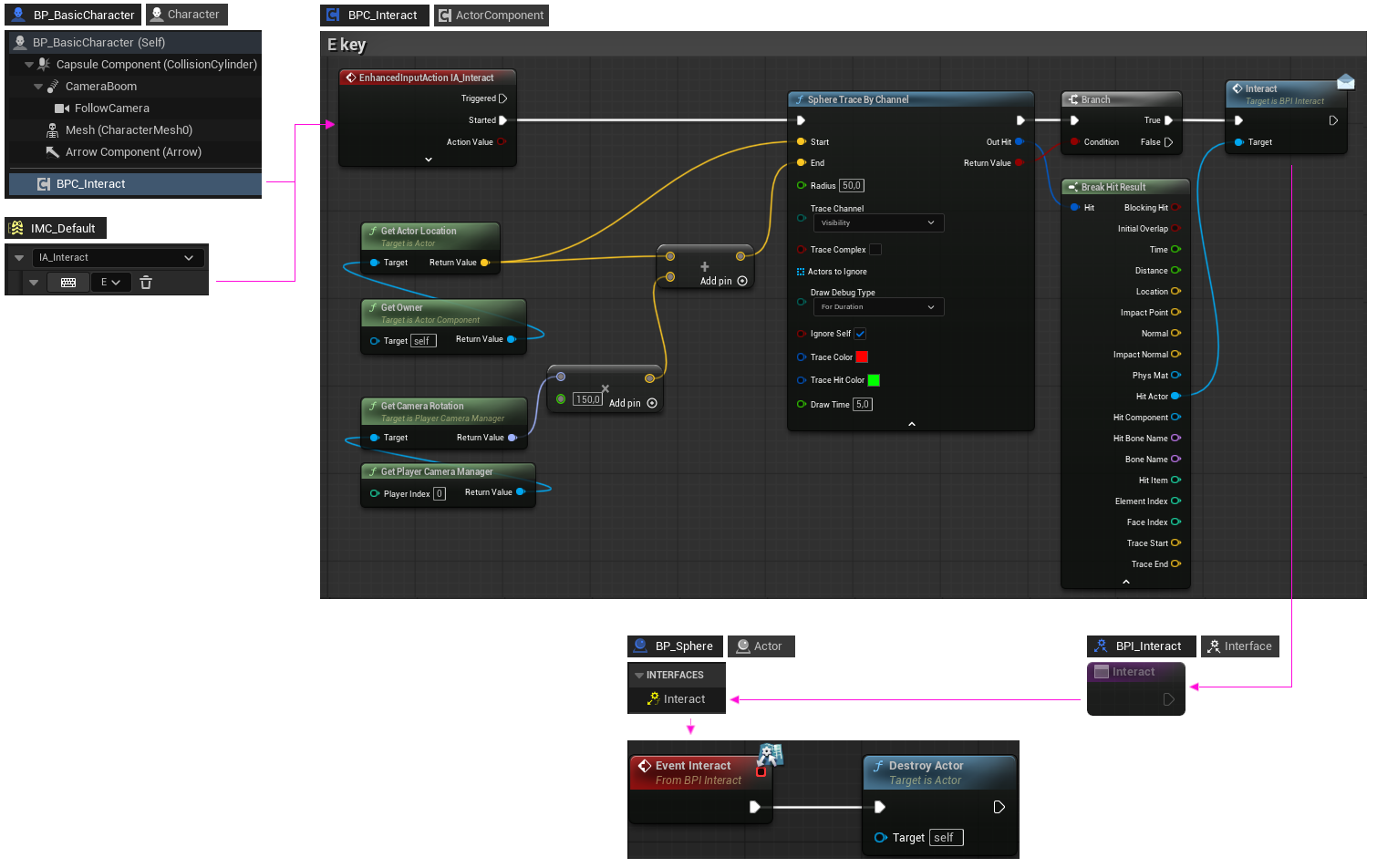 - "BP_BasicCharacter" nesnesine eklenen "BPC_Interact" nesnesi kullanarak, "EnhancedInputAction IA_Interact" zincirini tetikler.