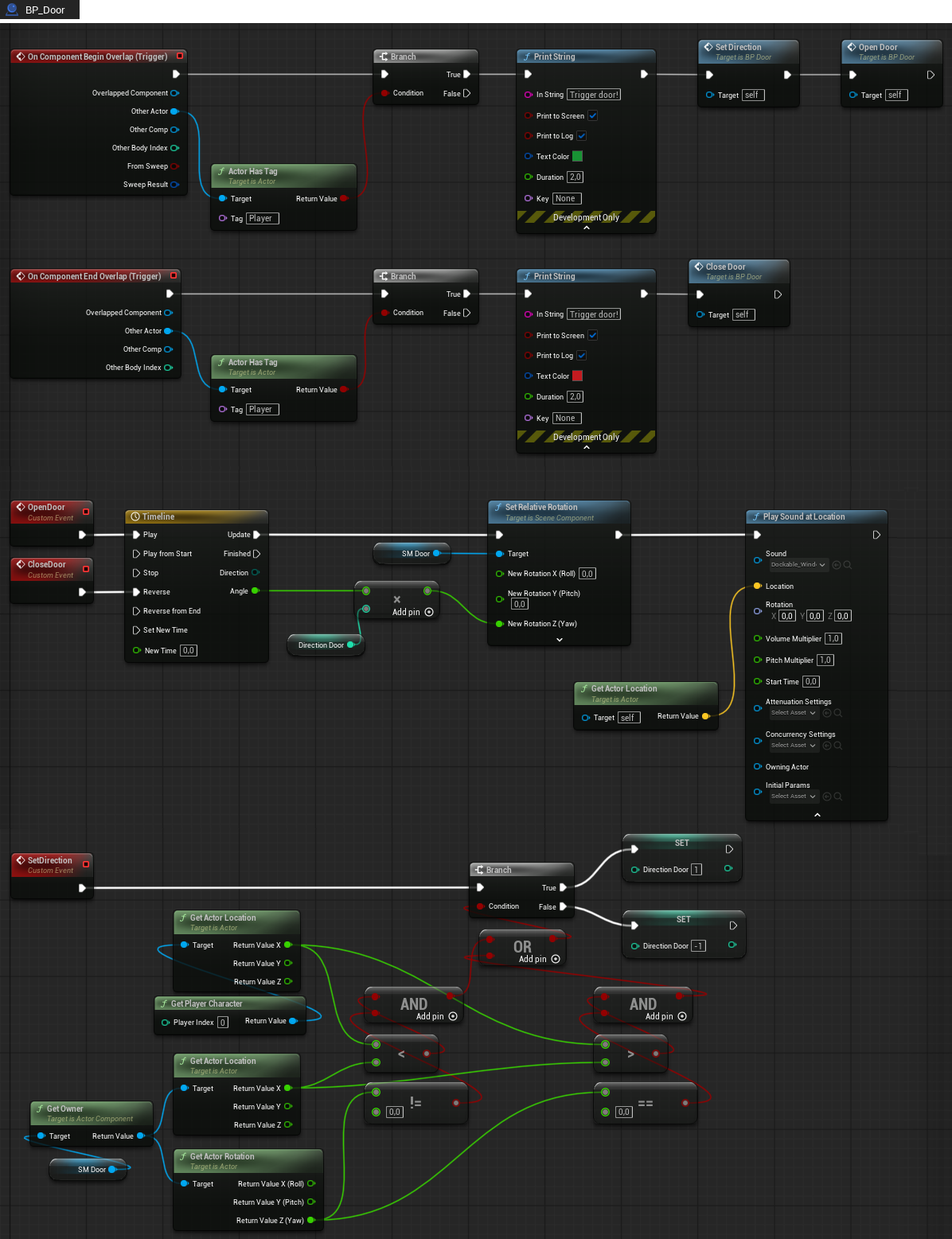 - "On Component Begin Overlap (Trigger)" zincirinde, "Print String" kutusundan sonra "Set Direction" kutusu oluşturup "Open Door" kutusuna bağlayalım.
