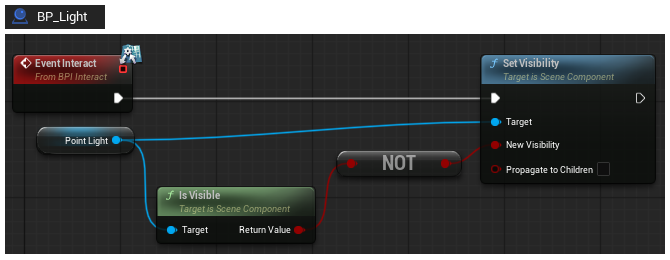 - "TurnLightOnOff" kutusunun çıkışını "Event Interact" zincirindeki "Set Visibility" kutusunun girşine bağlayalım.