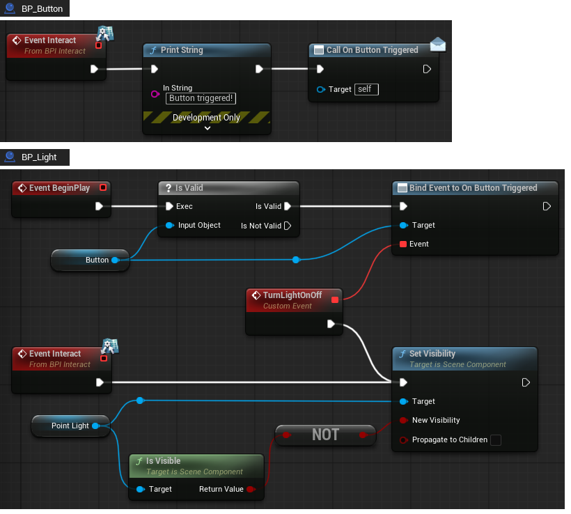 Bu durumda, oyuncu, "BP_Button" nesnesine yaklaşıp "E" tuşuna bastığında 3 lamba birlikte yanar, tekrar bastığında söner. İşlemler aşağıdaki sırayla gerçekleşir:
