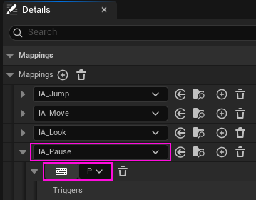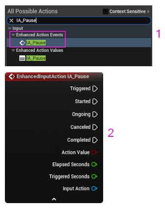4. BP_BasicCharacter EventGraph içinde fareyi sağ tıklayınca gelen pencerede "IA_Pause" yazınca gelen pencerede "Enhanced Action Events" altındaki "IA_Pause" değerini seçelim. Böylece, "EnhancedInputAction IA_Pause" kutusu açılır.