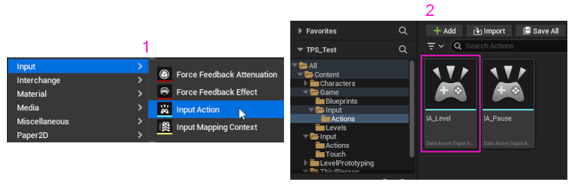 1. Actions dizini içinde iken, sağ tıklayıp açılan menüden, Input -> Input Action seçeneğini seçelim ve IA_Level olarak adlandıralım.