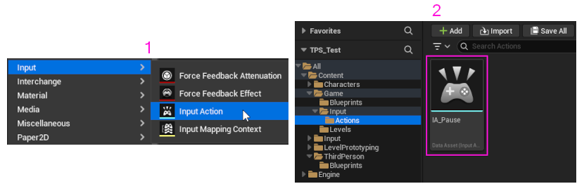 2. Actions dizini içinde iken, sağ tıklayıp açılan menüden, Input -> Input Action seçeneğini seçelim ve IA_Pause olarak adlandıralım.