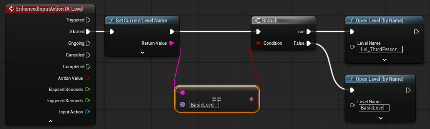 İki Level arasında geçiş yapmak için, her iki Level'ın "World Settings" sekmesindeki "GameMode Override" değerinin "BP_BasicGameMode" değerini içermesi gerekir. Çünkü, P ve L tuş girişlerinin içinde tanımlandığı EventGraph BP_BasicCharacter'e ait ve BP_BasicCharacter BP_BasicGameMode'un "Default Pawn Class" değeri olarak yüklendiğinden, P ve L tuş girişlerine işlem yapılabilmesi için, BP_BasicGameMode'un ve dolayısıyla da BP_BasicCharacter'in yüklenmesi gerekir.