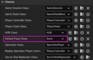 4. BP_MainMenuGameMode'a çift tıklayarak açalım ve "BP_MainMenuGameMode (Self)" seçili iken, "Details" sekmesinde "Default Pawn Class" değerini "None" olarak değiştirelim.