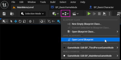 5. "MainMenuLevel" penceresi seçili iken, üstteki menüden "Open Level Blueprint" seçeneğini seçerek, "MainMenuLevel" EventGraph penceresini açalım.