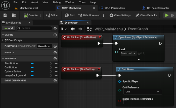 7. StartButton ve QuitButton butonlarına işlem yaptırmak için "WBP_MainMenu" penceresinde, aşağıdaki işlemleri yapalım: