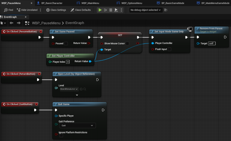 - "ReturnButton" seçili iken, "Details" sekmesinde en altta yer alan "Events" bölümünde "On Clicked" satırının sağındaki + butonuna tıklayarak, "WBP_PauseMenu" EventGraph penceresinde sahneye "On Clicked (ReturnButton)" kutusu ekleyelim.