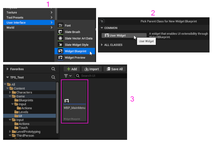 Projede ana menü için bir User Widget oluşturmak için aşağıdaki işlemleri sırasıyla gerçekleştirelim: