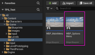 Ana menüdeki Options menü seçeneği için User Widget oluşturmak için aşağıdaki işlemleri sırasıyla gerçekleştirelim: