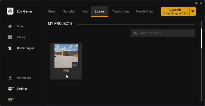 Unreal Engine ile daha önceden oluşturulmuş projeleri, Epic Games Launcher penceresinin "Library" sekmesindeki Projelerim bölümünden, Unreal Engine proje tarayıcısının RECENT PROJECTS bölümünden veya doğrudan disk üzerinde tıklayarak açabiliriz.