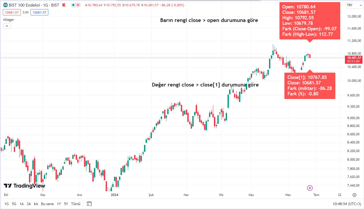 Değer rengi, close>close[1] ise yeşil, close<close[1] ise kırmızı olur.