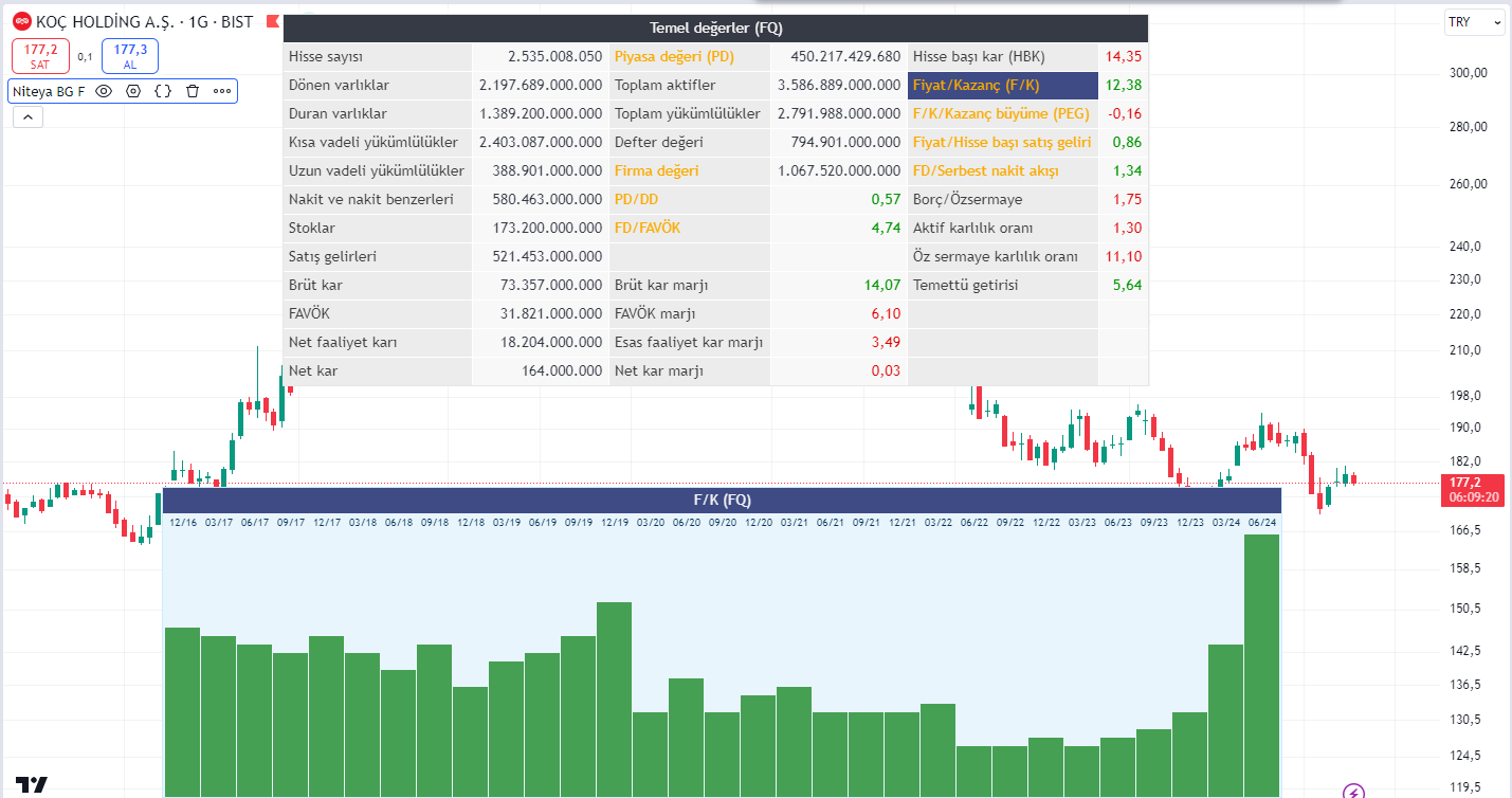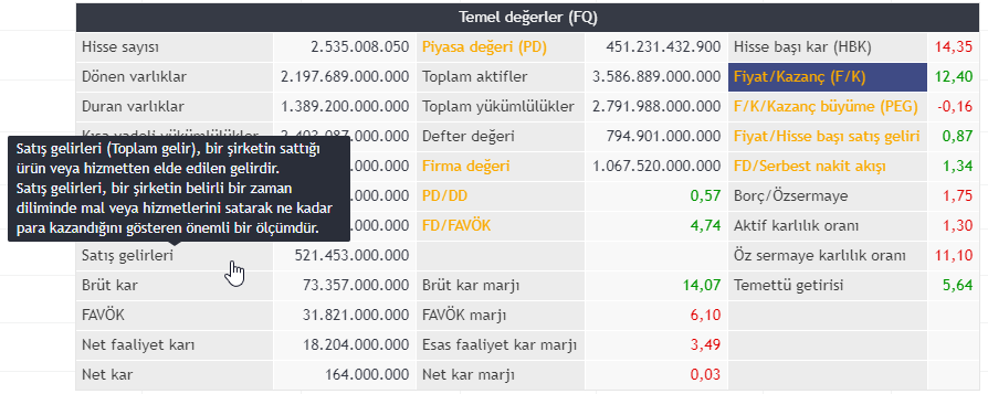 | Veri tablosunda, turuncu renkle gösterilen veri isimleri, doğrudan hisse kapanış fiyatından etkilenen değerleri gösterir. Temel analiz tablosunun açıklandığı tarihteki değerlerle güncel değerler farklılık gösterebilir. |