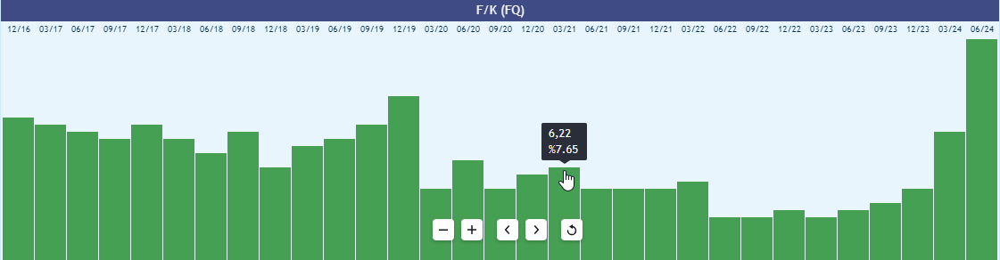 | Grafikteki hisseye ait seçilen bir verinin 2016 yılı son çeyrekten itibaren değerlerini grafik olarak ekranda gösterir. Değerler ile bir önceki çubuğa göre artış veya azalış değeri yüzde olarak, çubuk üzerinde ipucu penceresinde gösterilir. |