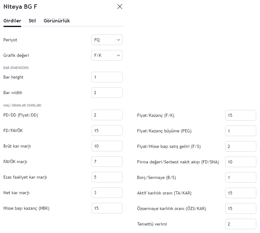 Niteya BG Fundamentals indikatörü, temel analiz verilerine göre çalışan ve grafikte seçili hisse ile ilgili 32 adet temel analiz verisini bir tablo ile seçilen bir verinin 2016 yılı son çeyrek dönemden itibaren değerlerini grafik ile ekranda gösteren bir indikatördür.