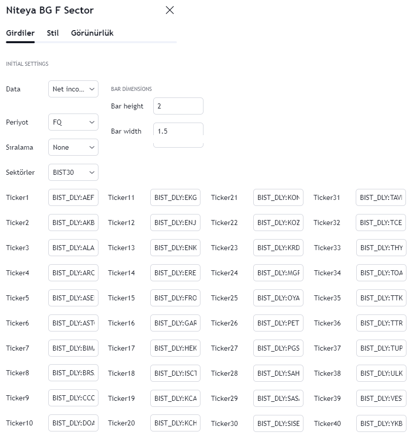 Niteya BG Fundamentals Sector indikatörü, 46 sektördeki 531 adet BIST hisse senedini, TradingView Platform'unda tanımlı 222 farklı temel analiz verisine göre, sektörel bazda değerlendirerek, sonuçları grafik ile ekranda gösteren bir temel analiz indikatörüdür.