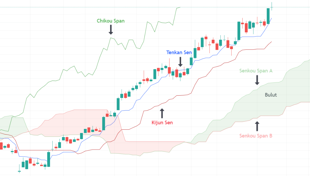 Ichimoku indikatörünün 6 temel bileşeni ile ilgili bilgiler ve grafik üzerinde gösterimleri aşağıdadır: