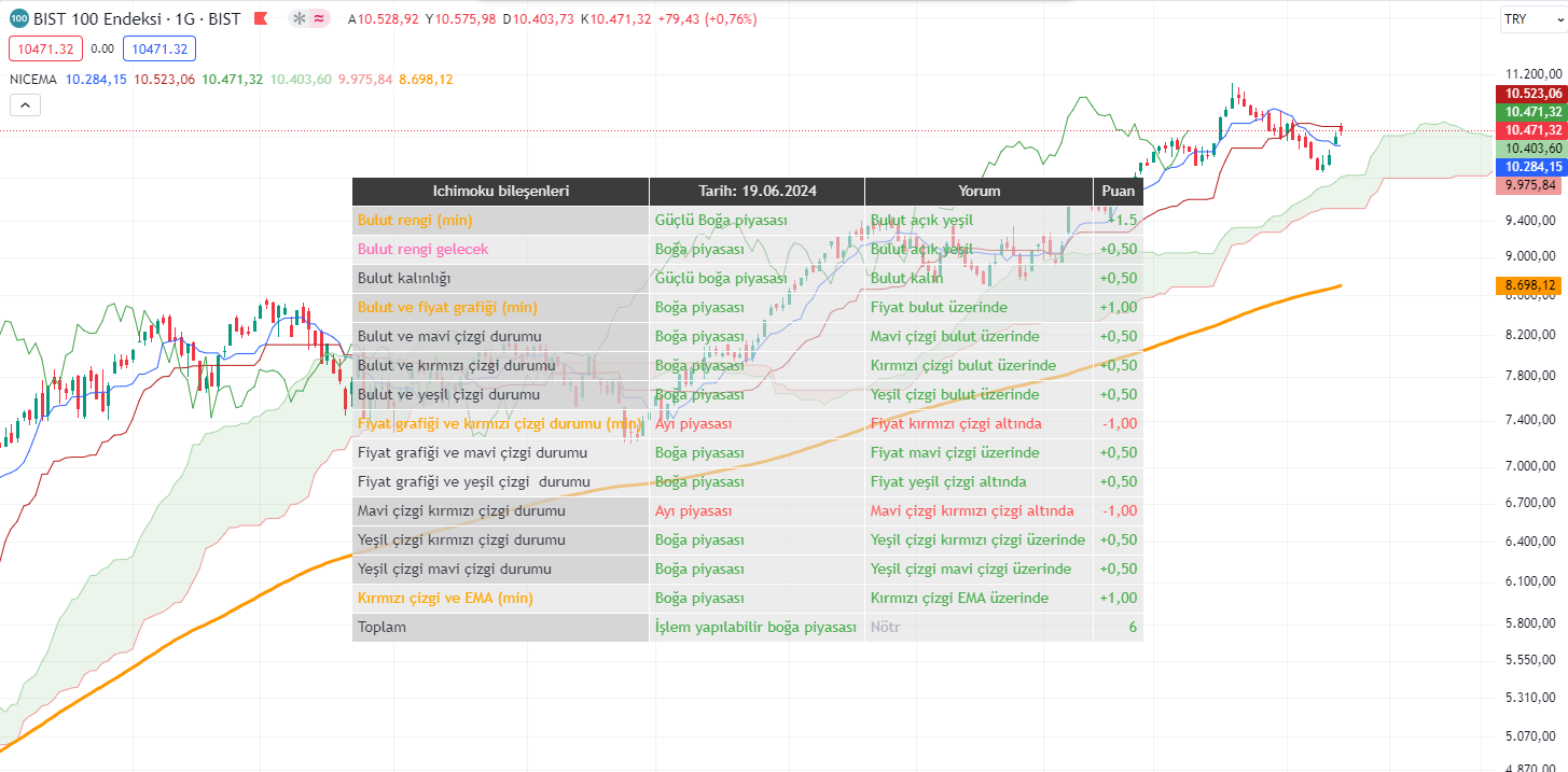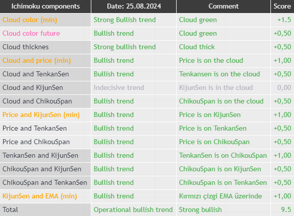 İndikatör, Ichimoku indikatör bileşenlerini, birbirleriyle olan konumlarını ve piyasaya etkilerini bir tablo halinde gösterir.