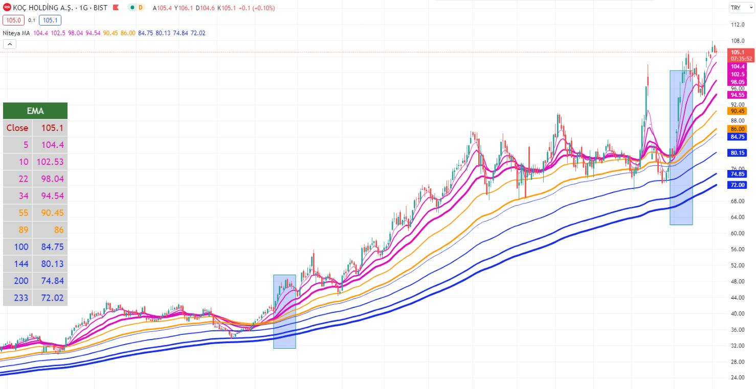 Kapanış fiyatı en üstte olmak üzere en düşük uzunluktaki hareketli ortalama değerinden en yüksek uzunluktaki hareketli ortalama değerine doğru sıra ile tabloda yer aldıklarında ideal alım koşulu gerçekleşir.