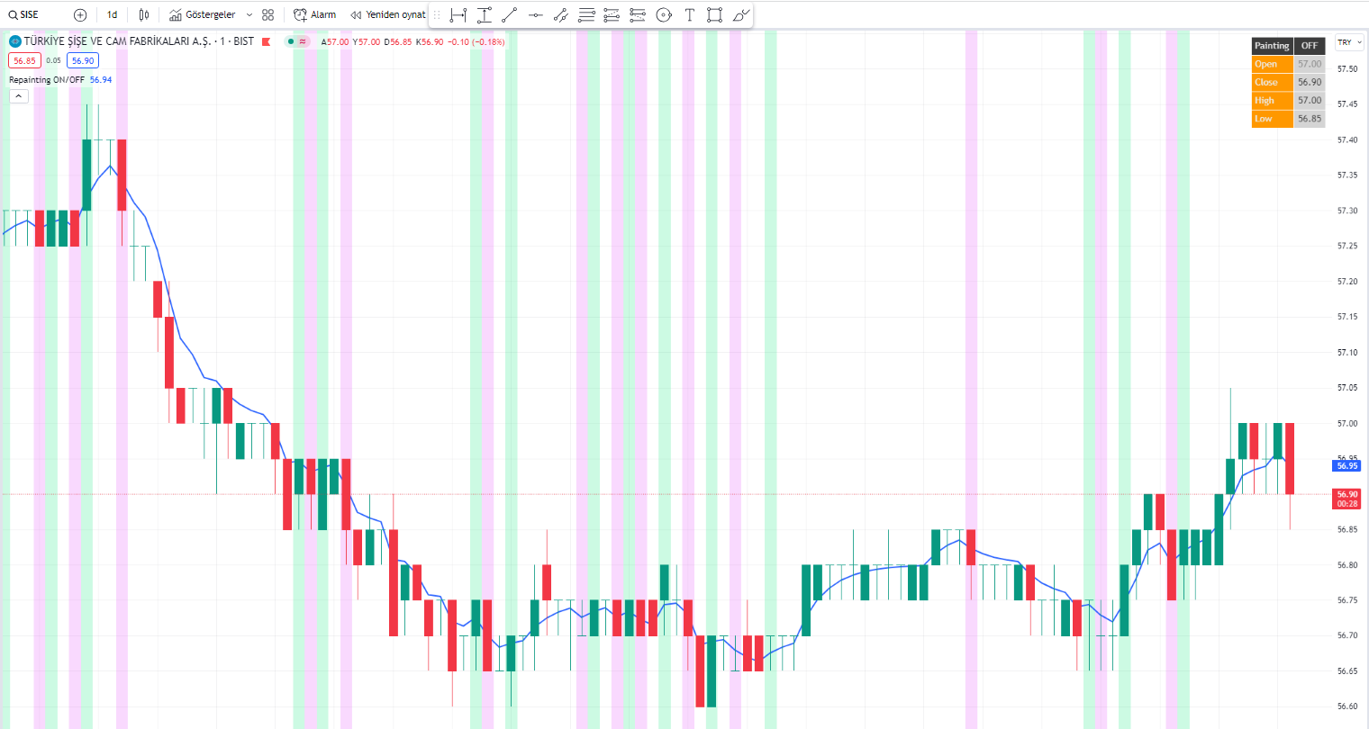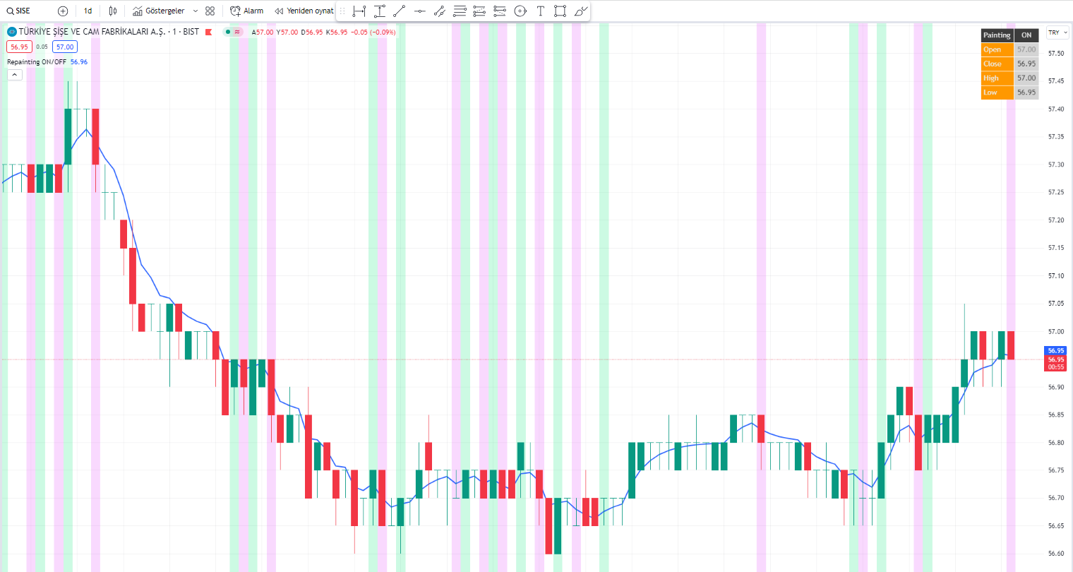 Göstergenin Painting değişken değeri, ön tanımlı olarak, seçili şekilde bırakıldığında, en son barda arka plan rengi kesişme işlemlerine bağlı olarak sürekli değişmektedir.
