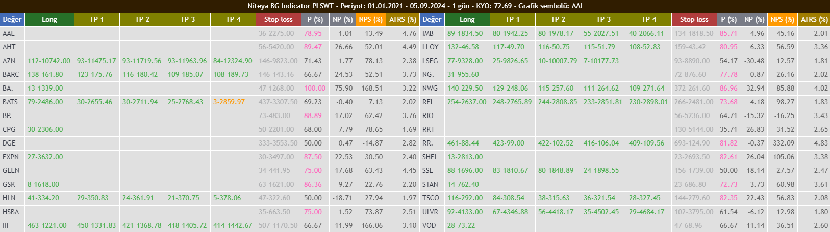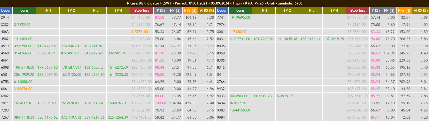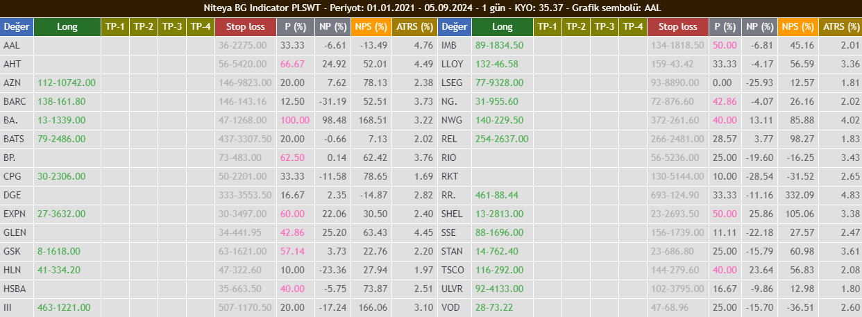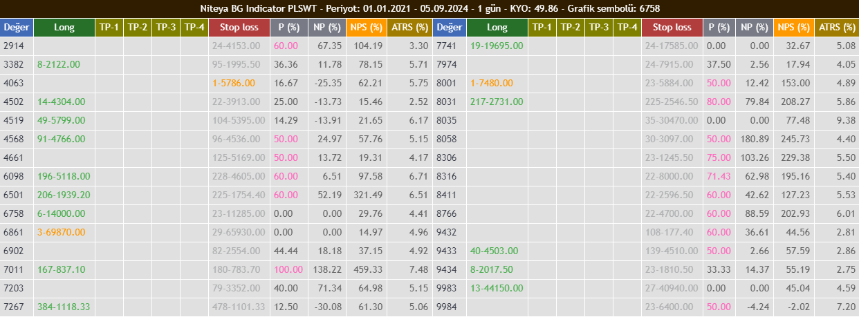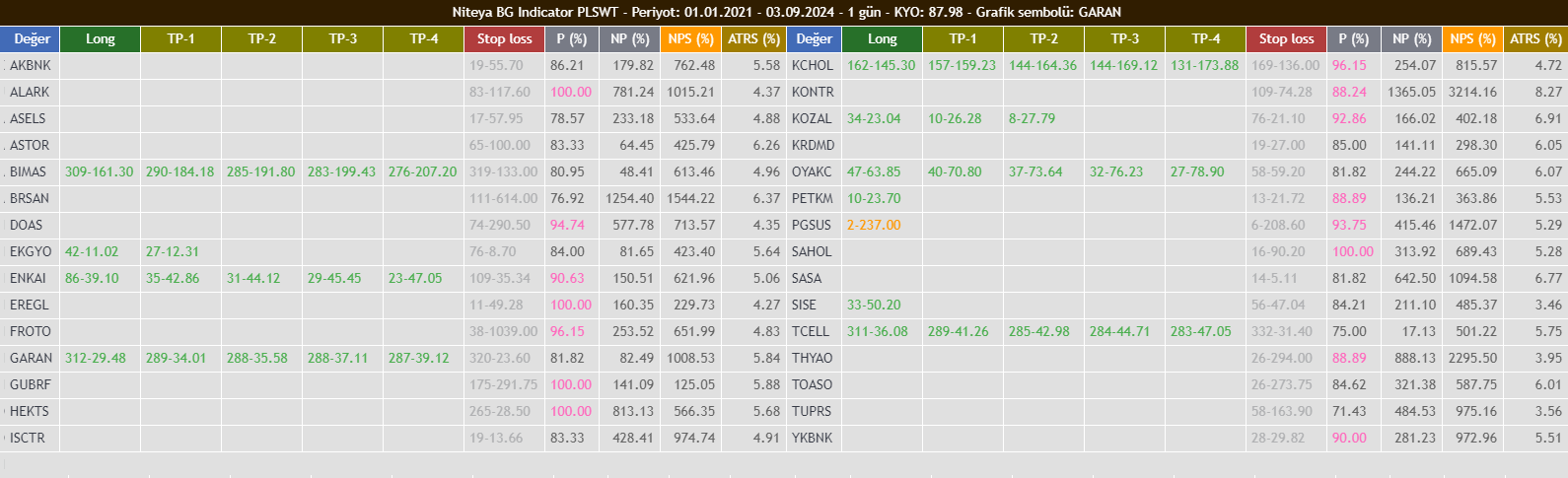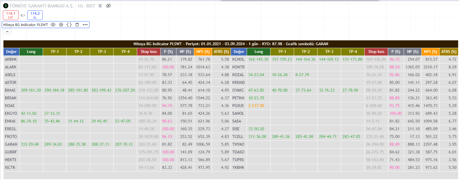 Niteya BG Indicator PLSWT indikatörü, Niteya BG Strategy PLSWT stratejisi ile 30 değer için oluşturulan long işlem giriş ve çıkış, kar alma seviyeleri, karlı yüzde ve net kar yüzde değerlerini tek bir tablo üzerinden takip etmek için kullanılır.
