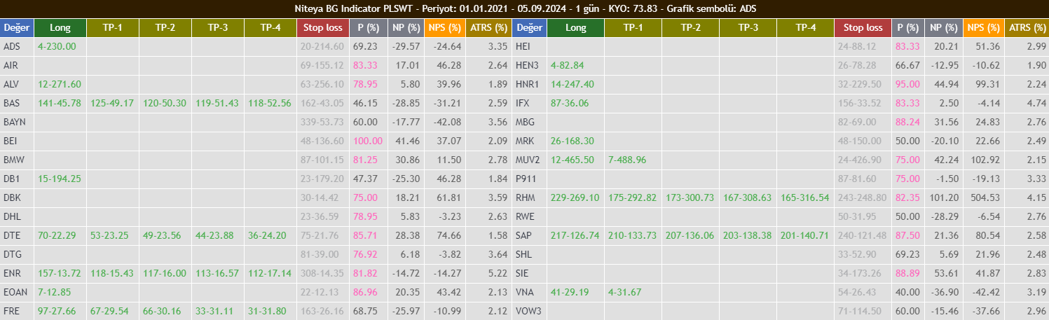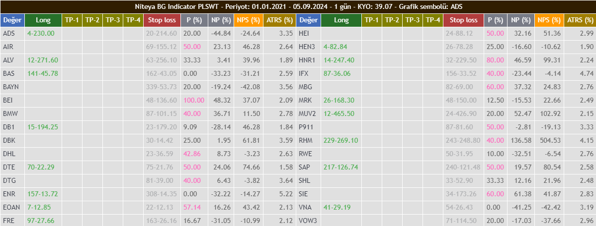 01.01.2021 - 05.09.2024 tarihleri arasında, Niteya BG Indicator PLSWT indikatörü ile piyasa değeri en yüksek 30 adet DAX hissesinin 1 günlük zaman periyodunda, 4 kar satışı ve kar satışı olmadan, yapılan backtest işlem sonuçları aşağıdaki grafiklerde gösterilmektedir. Bu çizelgelerden stratejinin hangi hisse senetleri için daha verimli sonuçlar elde ettiğini kontrol edebilirsiniz.