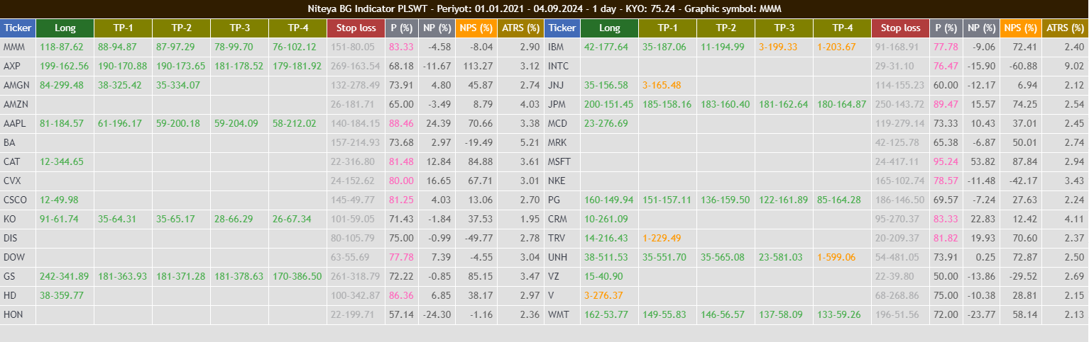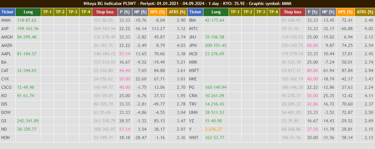 01.01.2021 - 04.09.2024 tarihleri arasında, Niteya BG Indicator PLSWT indikatörü ile DOW JONES hisselerinin 1 günlük zaman periyodunda, 4 kar satışı ve kar satışı olmadan, yapılan backtest işlem sonuçları aşağıdaki grafiklerde gösterilmektedir. Bu çizelgelerden stratejinin hangi hisse senetleri için daha verimli sonuçlar elde ettiğini kontrol edebilirsiniz.