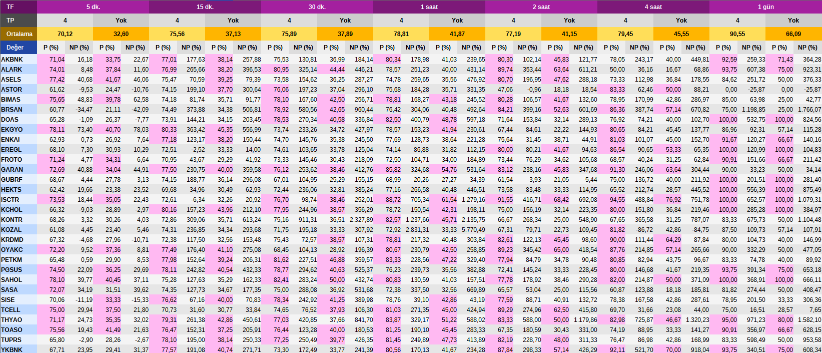 Pembe renkli arka planı olan değerler 3.satırdaki ortalama karlılık yüzdesinin üzerinde olan hisseleri göstermektedir.