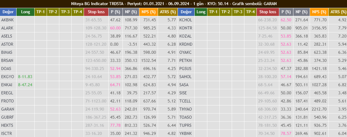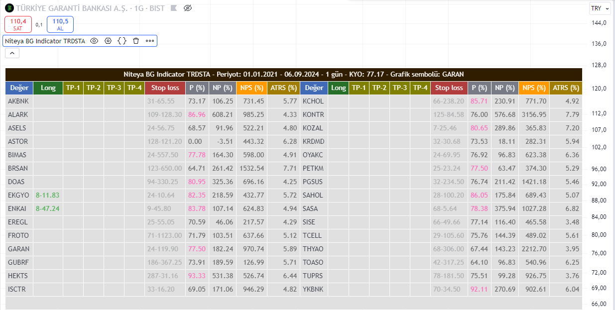 Niteya BG Indicator TRDSTA indikatörü, Niteya BG Strategy TRDSTA stratejisi ile 30 değer için oluşturulan long işlem giriş ve çıkış, kar alma seviyeleri, karlı yüzde ve net kar yüzde değerlerini tek bir tablo üzerinden takip etmek için kullanılır.