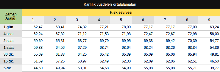 7 farklı zaman aralığında 9 risk seviyesi için 4 kar satışı ile 30 değer için yapılan backtest sonuçlarının ortalaması