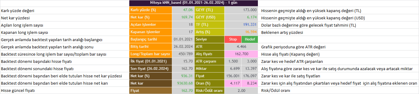 Aşağıdaki grafikte, stratejiyi yüklediğimizde ekrana gelecek olan tablonun değerleri ve açıklamaları gösterilmektedir: