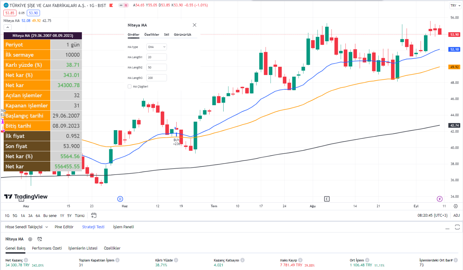 Bu strateji, aşağıda gösterilen ön tanımlı değerler ile kapanış değeri ve üç hareketli ortalama değeri kullanılarak oluşturulmuştur. Bir önceki stratejiye göre tek farkı iki yerine üç hareketli ortalama değeri kullanılmasıdır.