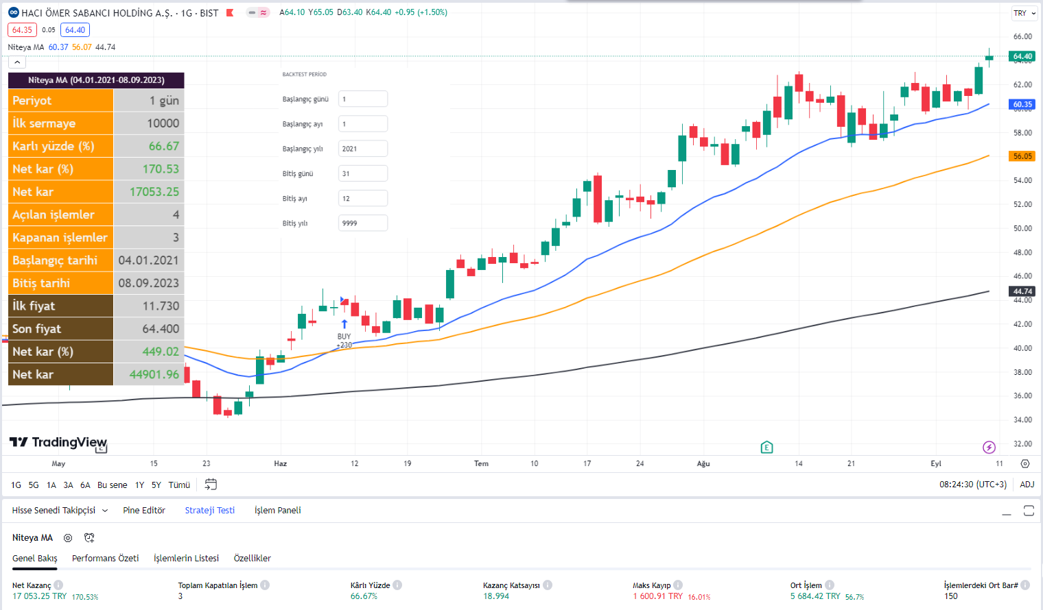 Bu strateji, aşağıda gösterilen ön tanımlı değerler ile kapanış değeri ve üç hareketli ortalama değeri kullanılarak oluşturulmuştur. Bir önceki stratejiye göre tek farkı backtest işlemleri tarih aralığının seçilebilmesidir.