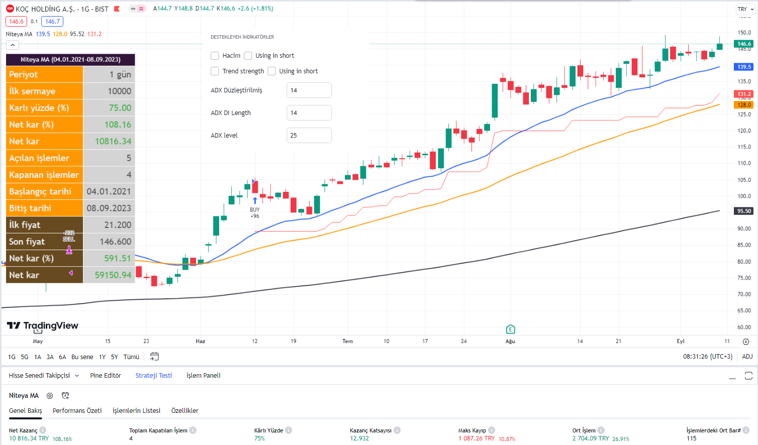 Bu strateji, aşağıda gösterilen ön tanımlı değerler ile kapanış değeri ve üç hareketli ortalama değeri kullanılarak oluşturulmuştur. Bir önceki stratejiye göre tek farkı trend ve hacim göstergelerinin isteğe bağlı olarak kullanılabilmesidir.