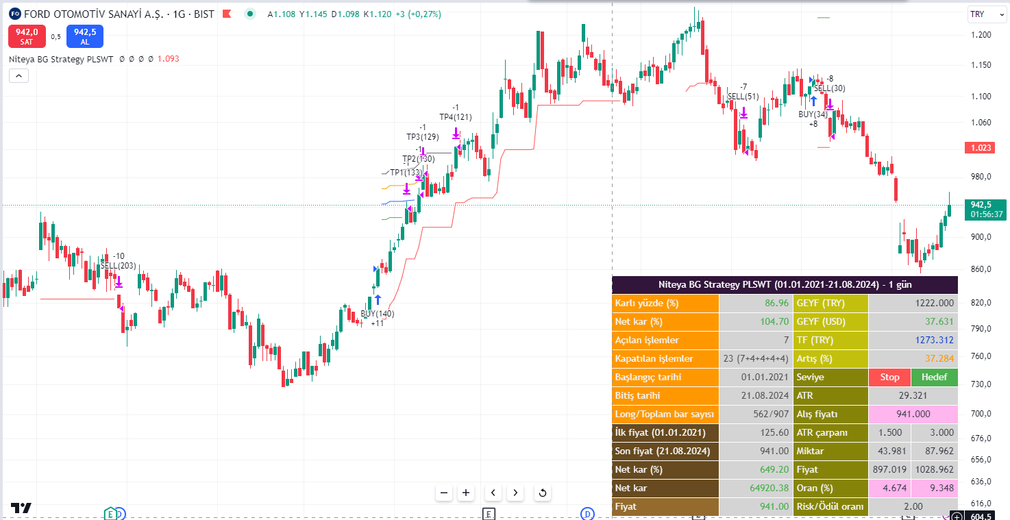 Yukarıdaki strateji ile ilgili olarak, 01.01.2021 - 03.09.2024 tarihleri arasında, Niteya BG Indicator PLSWT indikatörü ile BIST30 hisseleri için 1 günlük zaman periyodunda, 4 kar satışı ve kar satışı olmadan, yapılan backtest işlem sonuçları aşağıdaki grafiklerde gösterilmektedir. Bu çizelgelerden stratejinin hangi hisse senetleri için daha verimli sonuçlar elde ettiğini kontrol edebilirsiniz.