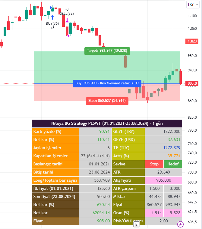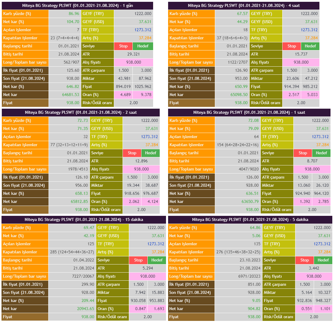 Niteya BG Strategy PLSWT ile, seçilen tarihler arasındaki backtest sonuçları strateji tablosunun sol tarafındaki turuncu renkli arka planı olan 7 hücrede gösterilmektedir.