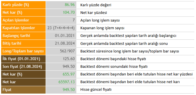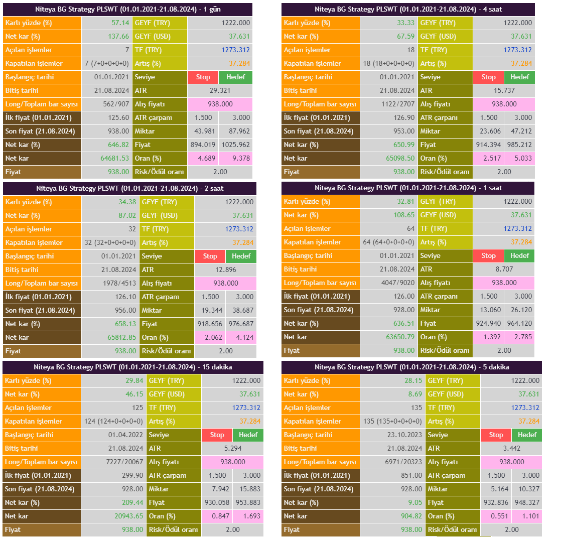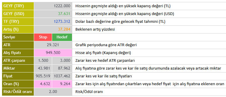 Strateji dahilinde kullanılan tüm giriş değerleri, backtest sonuçları, hissenin geçmişte dolar ve TL. bazında aldığı en yüksek kapanış değeri, dolar bazında gelecek TL. fiyat tahmini ve beklenen artış yüzdesi ile grafik periyoduna uygun olarak elde edilen ATR değeri ile hedef ve zarar kes oranları ve fiyatları bir tabloda gösterilir.