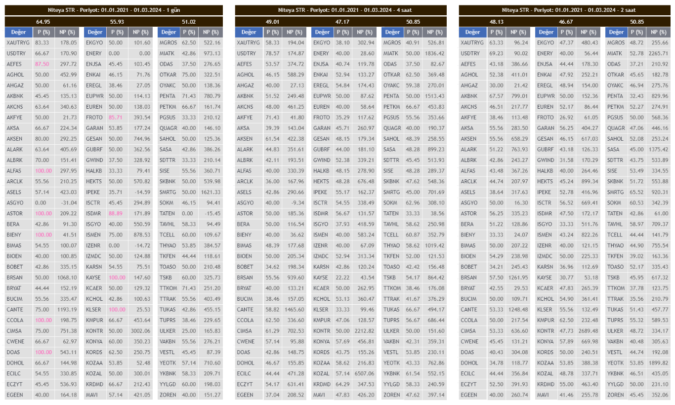 Aşağıda verilen 6 farklı zaman periyodundaki grafiklerin backtest aralığı 01.01.2021 - 01.03.2024 olarak yapılmasına rağmen,TradingView ortamındaki 5000 bara kadar okuma sınırlaması nedeniyle 1 saatlik, 30 dakikalık ve 15 dakikalık backtest işlemlerinde başlangıç tarihleri ileri doğru kaydırılmaktadır. Zaman periyodları gerçek backtest aralıkları aşağıdaki çizelgede gösterilmektedir: