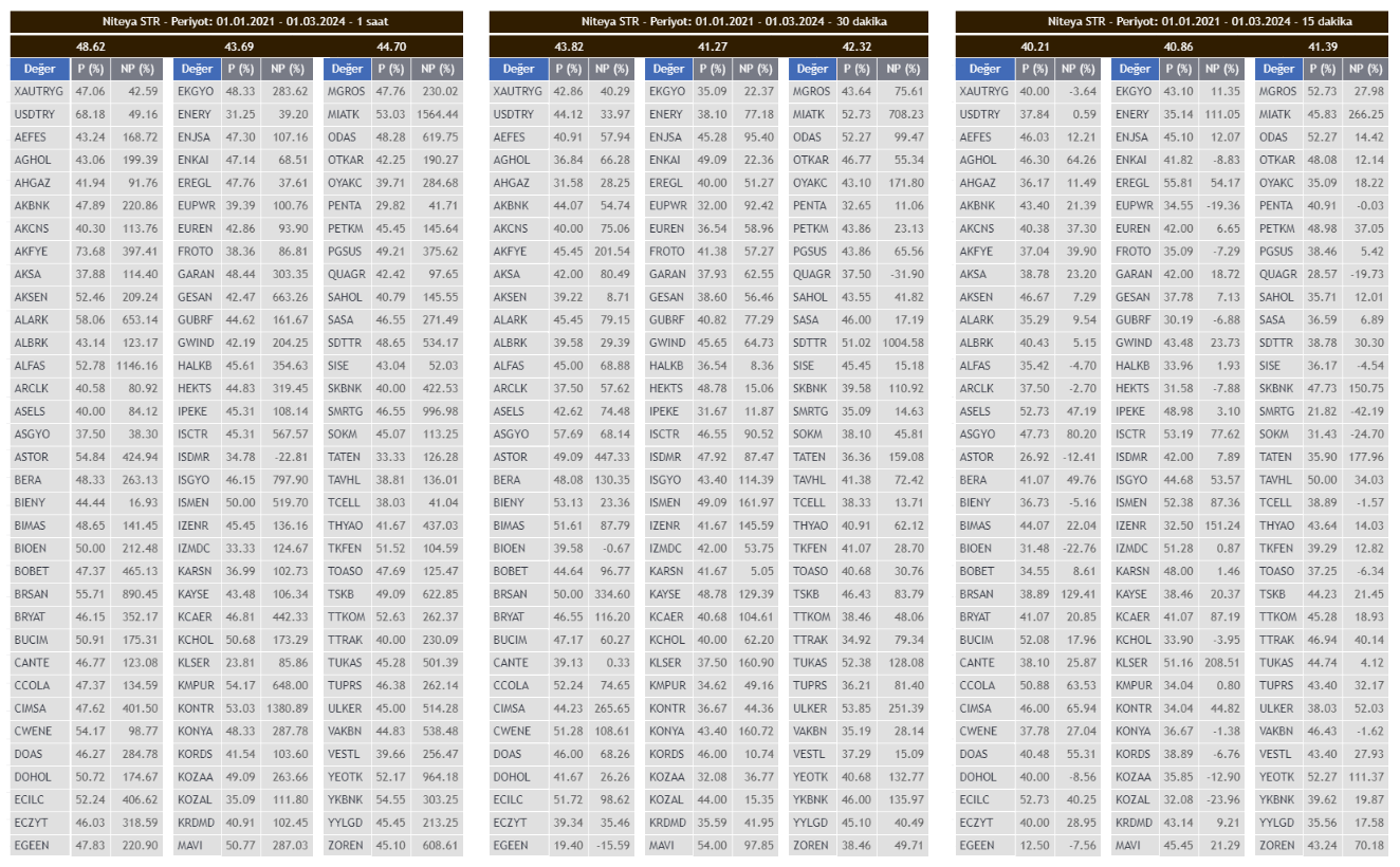 Periyot Başlangıç Bitiş 1 gün 01.01.2021 - 01.03.2024 4 saat 01.01.2021 - 01.03.2024 2 saat 01.01.2021 - 01.03.2024 1 saat 03.01.2022 - 01.03.2024 30 dakika 02.01.2023 - 01.03.2024 15 dakika 01.08.2023 - 01.03.2024