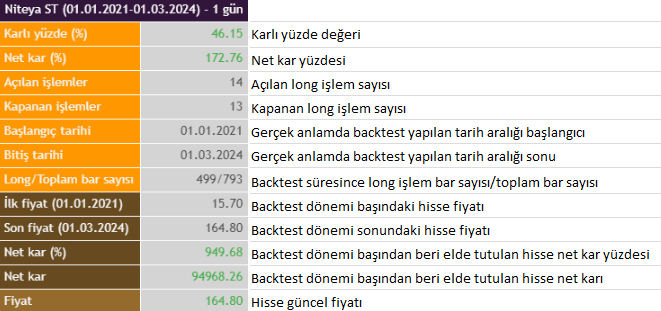 Yukarıdaki strateji ile ilgili olarak, 02.03.2024 tarihinde gram altın, USDTRY ve BIST100 hisseleri ile 1 gün, 4 saat, 2 saat, 1 saat, 30 dakika ve 15 dakikalık zaman periyodlarında yapılan backtest işlem sonuçları aşağıdaki grafiklerde gösterilmektedir. Bu çizelgelerden stratejinin hangi hisse senetleri için daha verimli sonuçlar elde ettiğini kontrol edebilirsiniz.