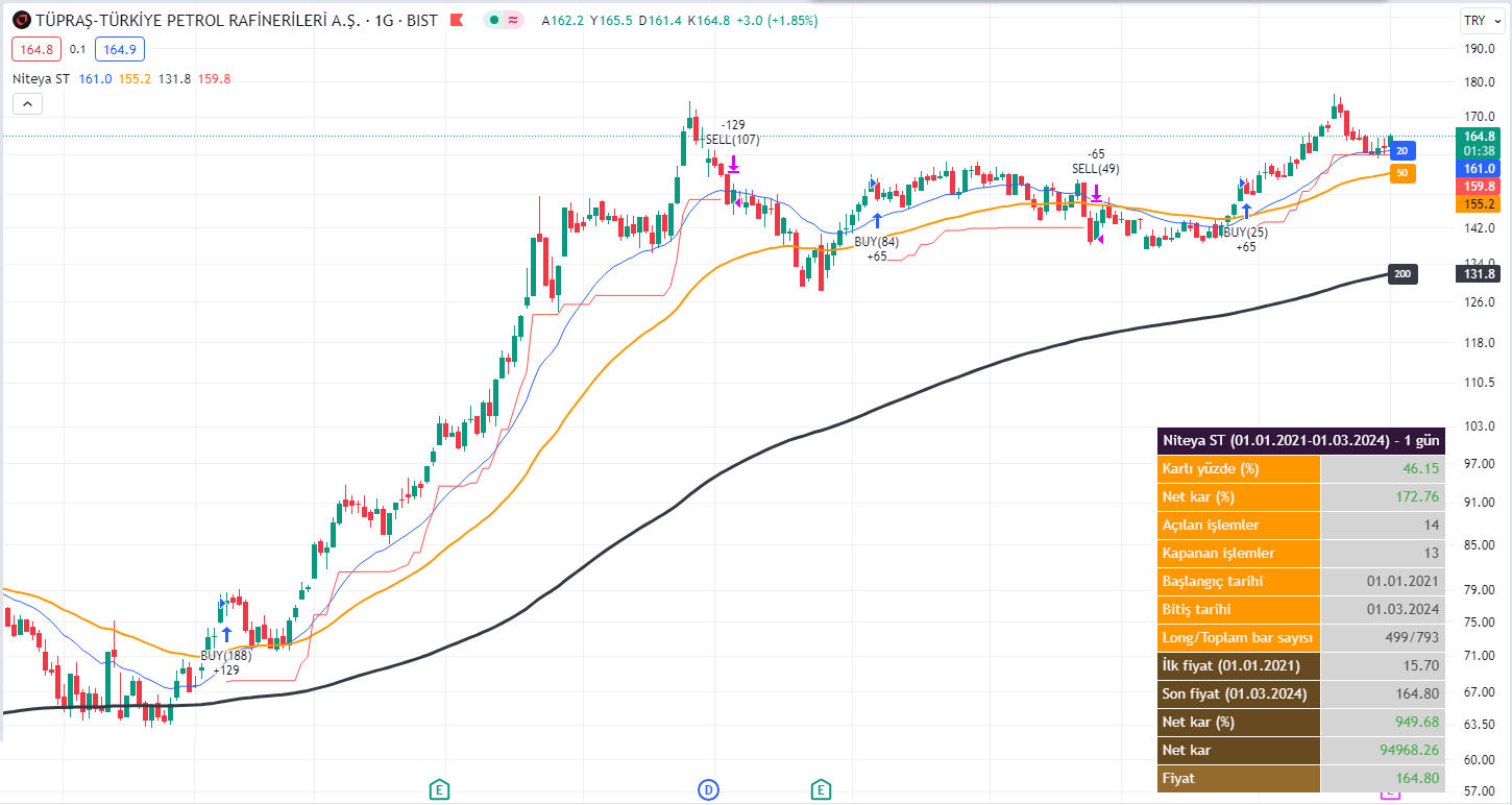 Stratejide, alım işlemi koşulu için, SuperTrend göstergesi, EMA 200 ile birlikte kullanılır.