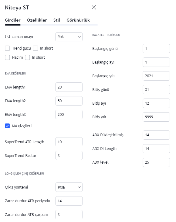 Aşağıdaki grafikte, stratejinin ön tanımlı değerleri gösterilmektedir: