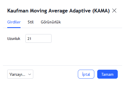 KAMA göstergesinin ön tanımlı periyod uzunluğu 21'dir.