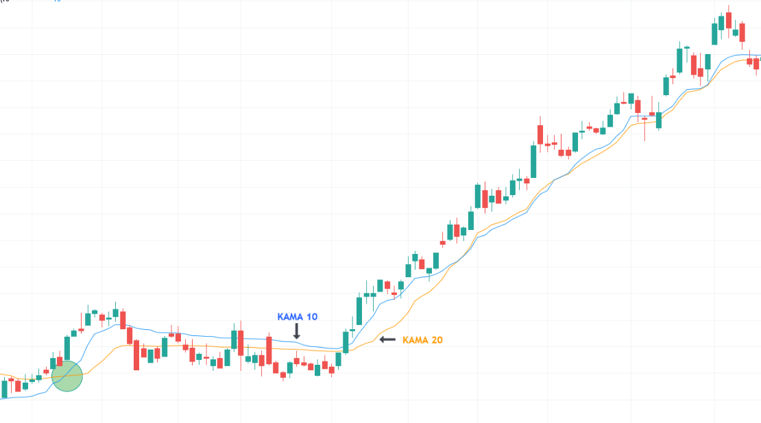 Aşağıdaki günlük grafikte, bir hisseye ait fiyat değerleri ile iki KAMA gösterge çizgisi yer kamaktadır. KAMA 10 çizgisinin KAMA 20 çizgisini yukarı doğru kestiği noktada al sinyali verilir: