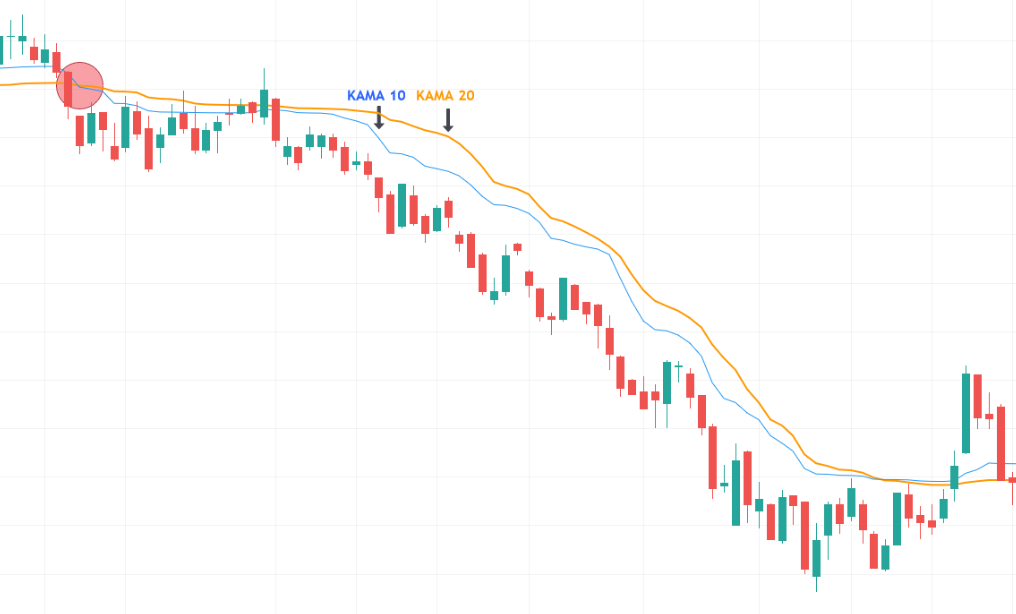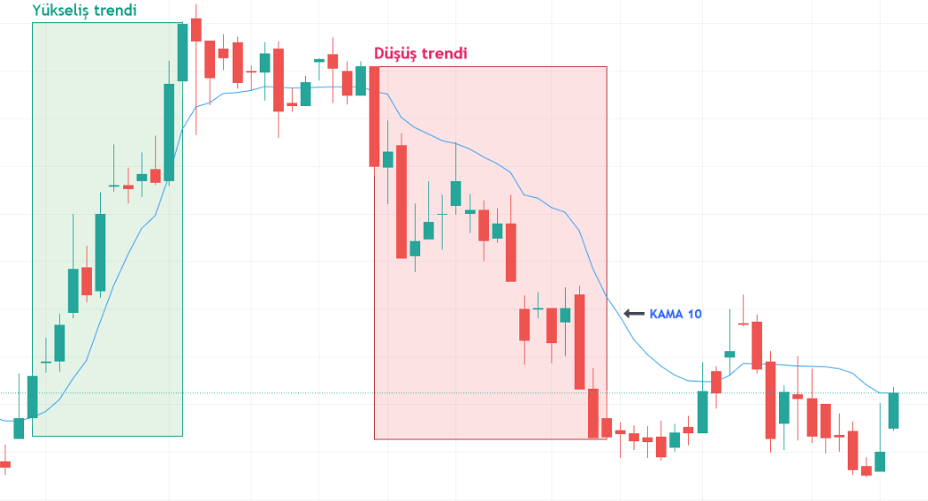KAMA göstergesi, mevcut piyasa fiyatı hareketinin genel trendini belirlemek için kullanılır. KAMA gösterge çizgisi aşağı hareket ettiğinde, bir düşüş trendini, yukarı hareket ettiğinde ise yükseliş trendini gösterir. SMA ile karşılaştırıldığında, KAMA göstergesinin hatalı sinyal üretme olasılığı daha düşüktür.